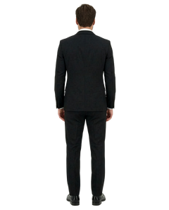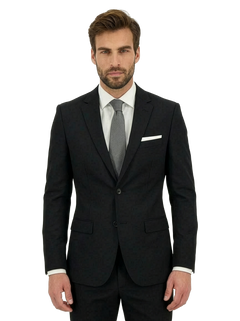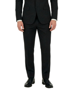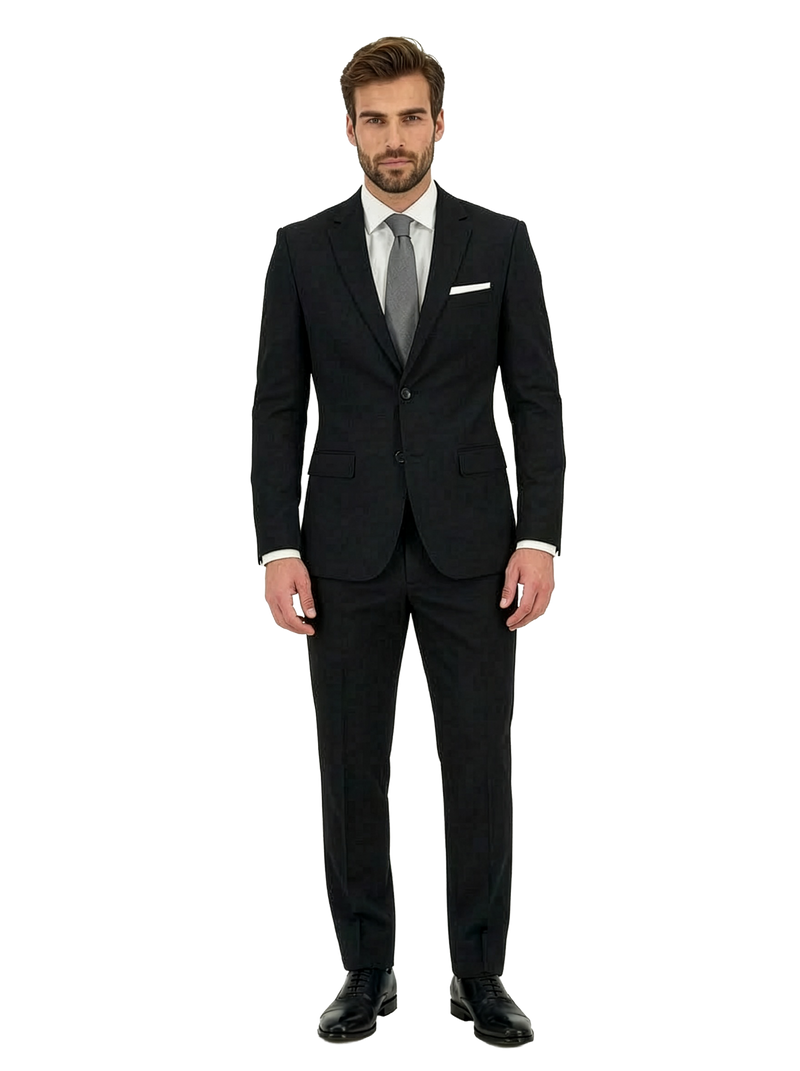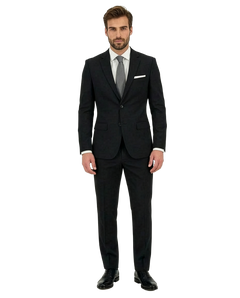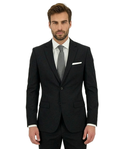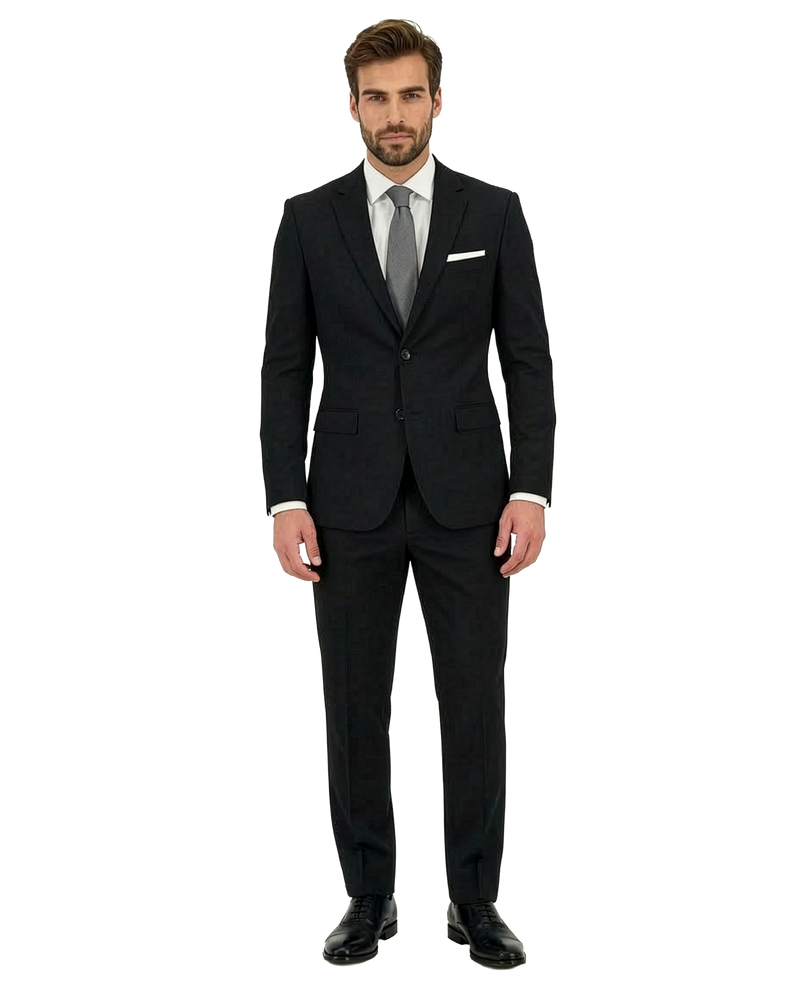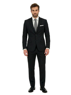 Giacca monopetto a due bottoni con tasche a pattina pantaloni senza pences.