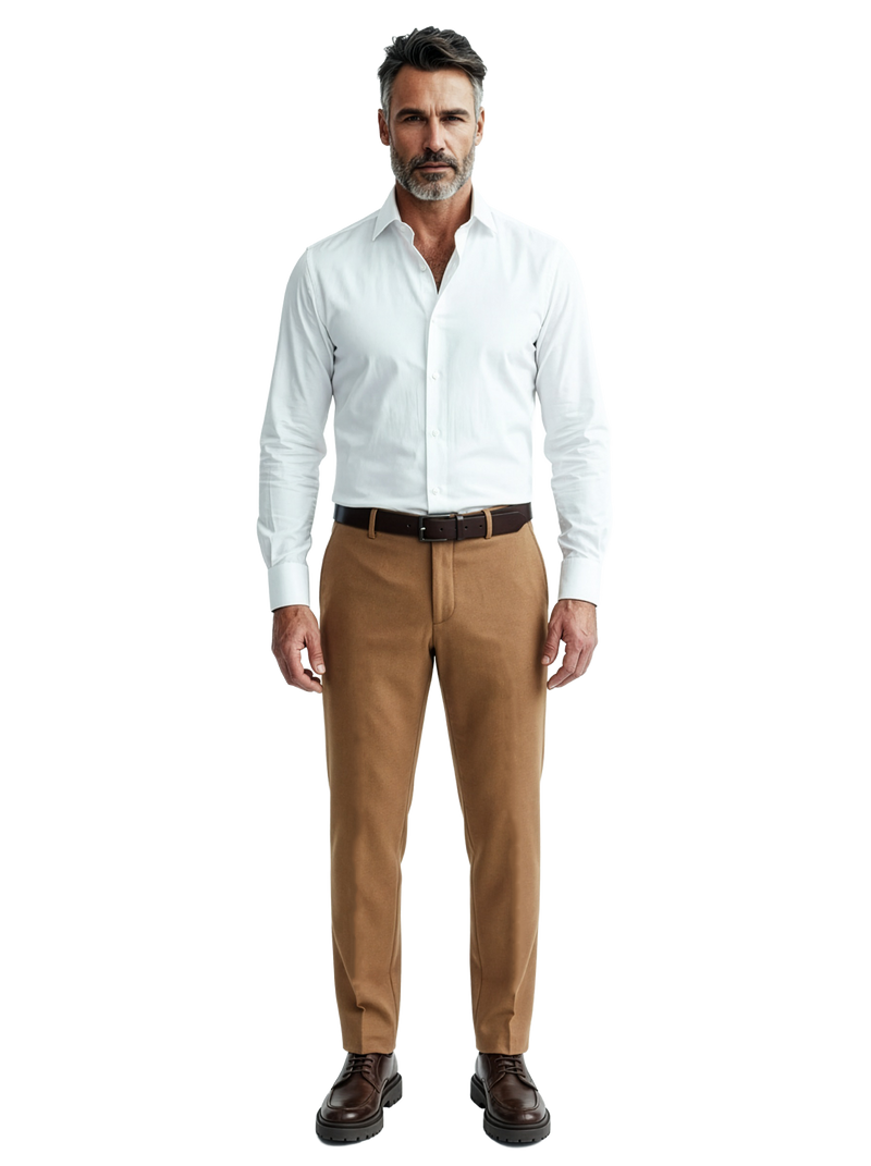 Pantalone classico in tessuto flanellato, caratterizzato da una superficie leggermente felpata che garantisce calore e morbidezza.